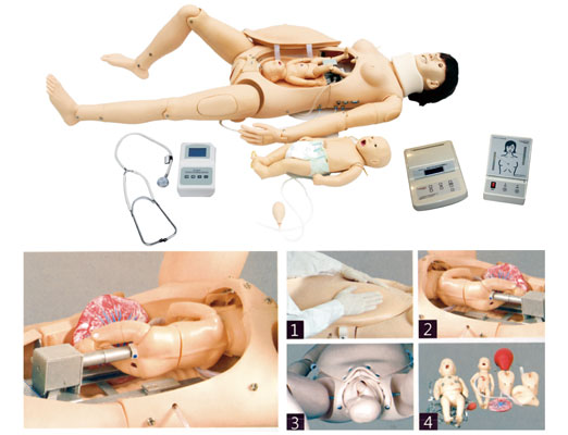 高級分娩與母子急救模型 該綜合教學模型很好的結合了護理模型和產科分娩模型,可進行產前檢查,演示整個分娩過程(包括產前、產時和產后)以及母嬰的護理和急救。